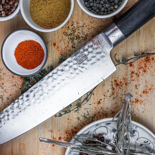 Nuestra colección Gyuto PAKKA está forjada en acero inoxidable japonés 440C con alto contenido de carbono, lo que aumenta aún más la durabilidad de su filo (HRC 60). Su hoja de 20 centímetros tiene el tamaño ideal para un equilibrio perfecto entre mango y hoja. El Gyuto KOTAI combina lo mejor de dos mundos distintos: el filo japonés y la resistencia alemana. Además, el martillado (presente en todos nuestros cuchillos) en la hoja evita que los alimentos se peguen al cortar.
