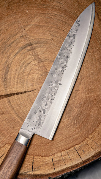 Le martelage des lames de couteau de cuisine se décline en plusieurs styles distincts, chacun conférant à la lame des propriétés et une apparence uniques. Le martelage Tsuchime par exemple se distingue par ses marques de marteau petites et uniformes, qui rappellent des gouttes de pluie. Grâce aux petites poches d’air qui se forment dans ces marques, les couteaux martelés empêchent les aliments humides comme les légumes de coller à la lame lors de la découpe, et réduisent également l’adhérence des viandes au couteau.
