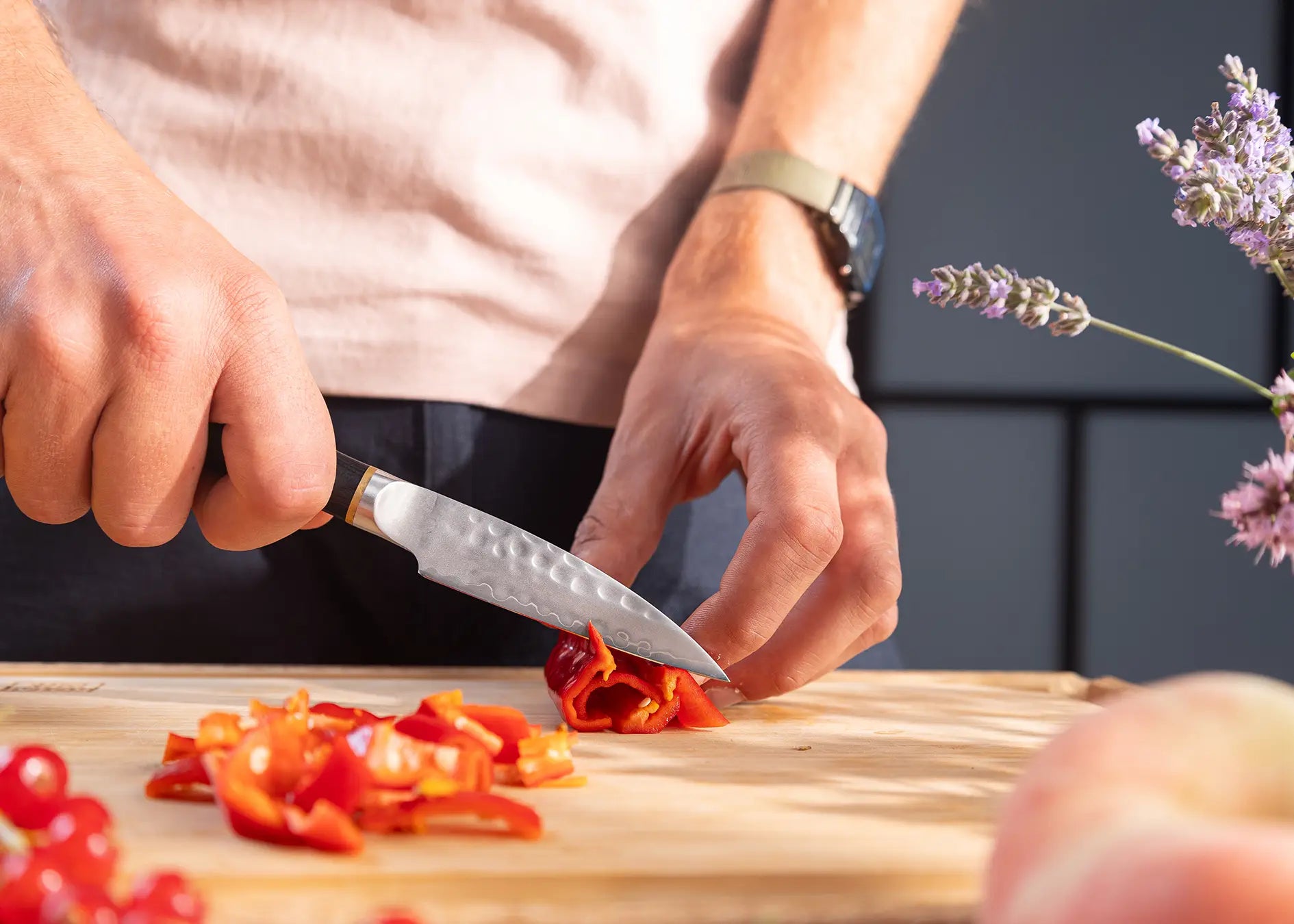 "Le manche tient bien dans la main et est bien équilibré. J'adore le motif martelé à la main sur la lame. Excellent travail."