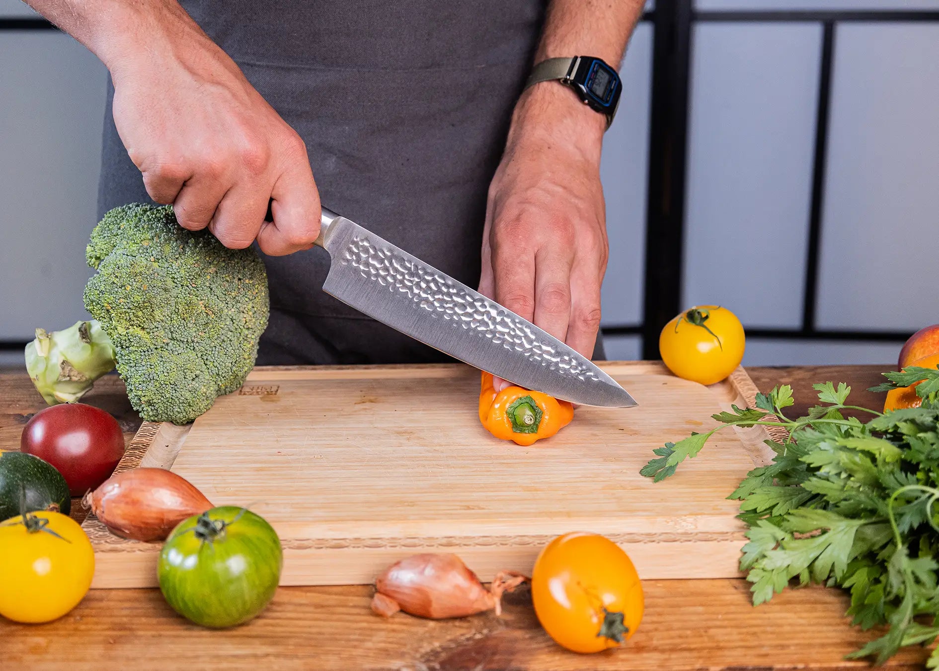Aesthetically appealing and functional, the hammered pattern creates tiny pockets of air between the blade and the food being cut.