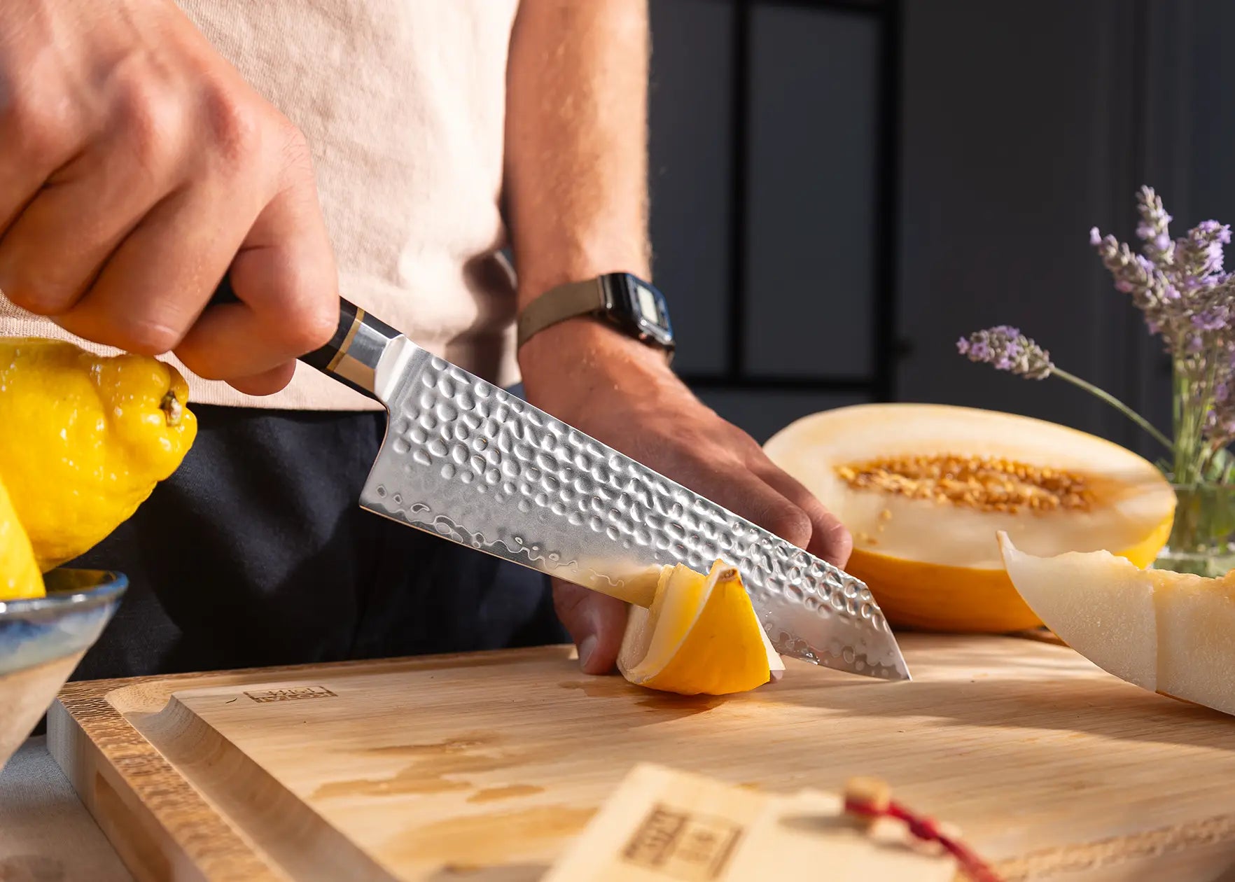 "Le manche tient bien dans la main et est bien équilibré. J'adore le motif martelé à la main sur la lame. Excellent travail."